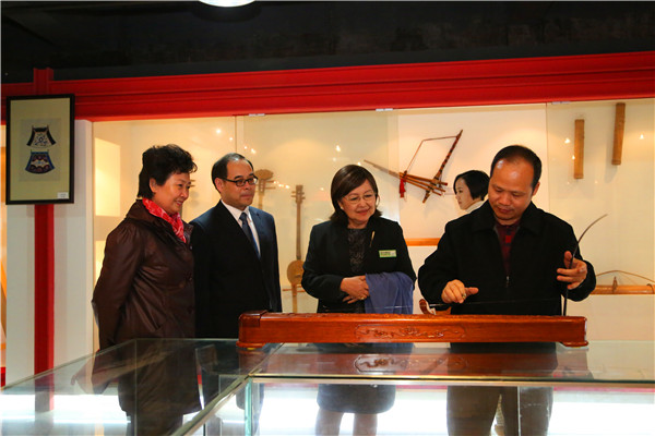 艺术研究院陈坤鹏副院长(右一)为中心主任婵塔薇女士(右二)演示独弦琴