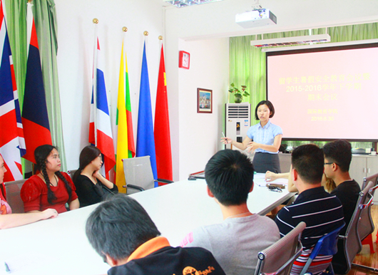 接下来,黄妍老师根据自治区教育厅桂教国交[2016]61号文件要求,对留学生进行暑假安全教育,一再强调假期要注意人身安全和财产安全,要安全用电以及防火、防盗、防中暑,积极配合学校装修宿舍前的要求,整理打包个人物品并做好标记。会议的最后向同学们通告下学期开学注册的时间和安排,对注册流程预先进行讲解,以便顺利开展下学期开学工作。此次会议是国际教育学院加强来华留学生管理和教育的具体实践,是落实我校精细化管理和教育国际化的必要举措。